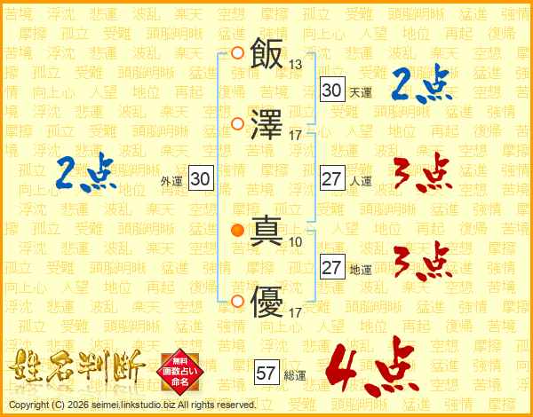 生活面を象徴する運勢です。外部から受ける影響力を表し、結婚運、家庭運や職場、環境への順応性を表します。総運から人運を引いた画数。姓や名が1文字の場合を除く。