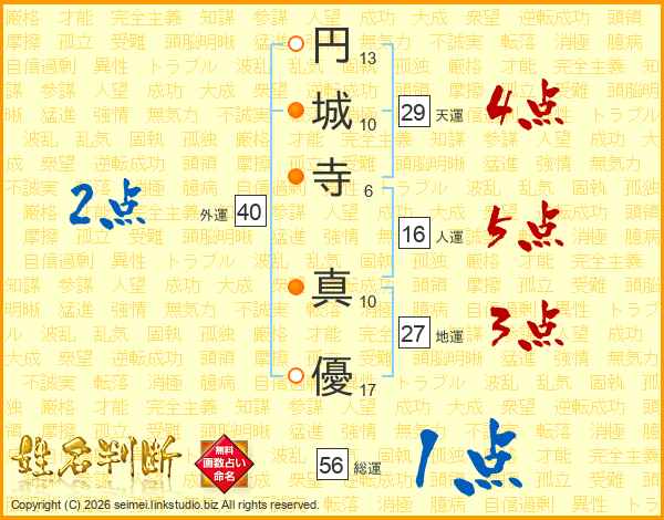 円(13画)城(10画)寺(6画) 真(10画)優(17画)