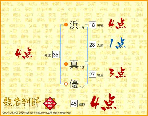 生活面を象徴する運勢です。外部から受ける影響力を表し、結婚運、家庭運や職場、環境への順応性を表します。総運から人運を引いた画数。姓や名が1文字の場合を除く。