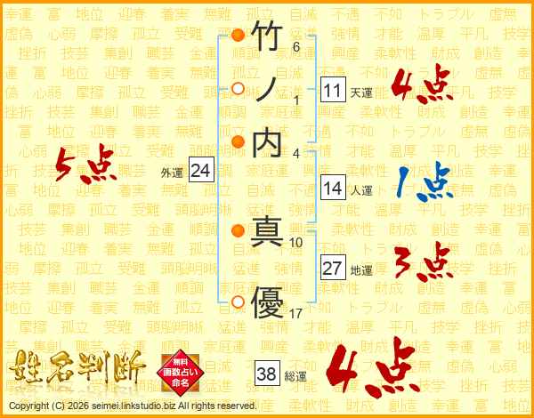 竹(6画)ノ(1画)内(4画) 真(10画)優(17画)