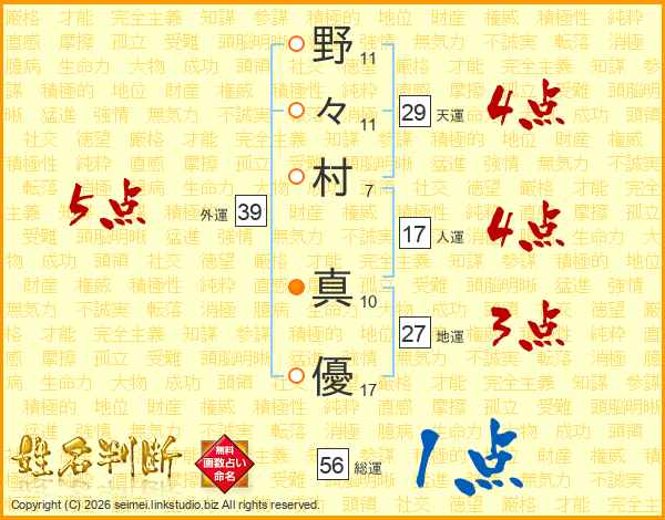 野(11画)々(11画)村(7画) 真(10画)優(17画)