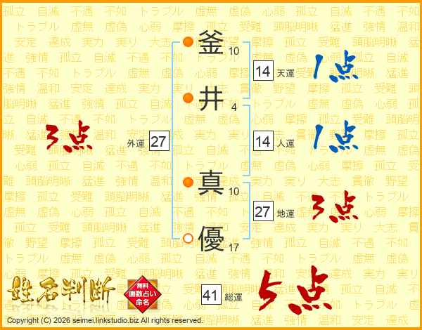 釜(10画)井(4画) 真(10画)優(17画)