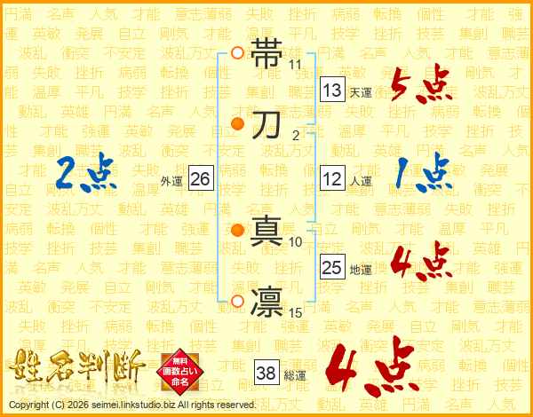帯刀真凛さんの総運は38画の4点!