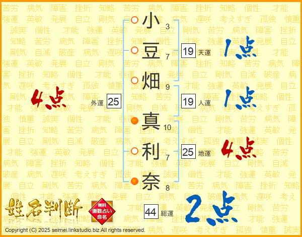 小(3画)豆(7画)畑(9画) 真(10画)利(7画)奈(8画)