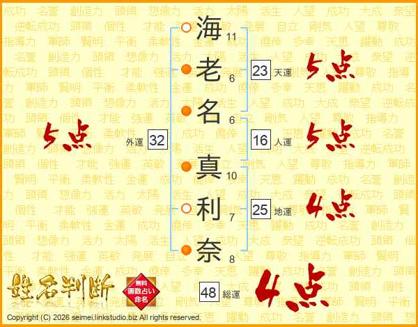 海(11画)老(6画)名(6画) 真(10画)利(7画)奈(8画)