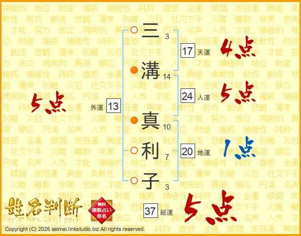 三溝真利子さんの総運は37画の5点!