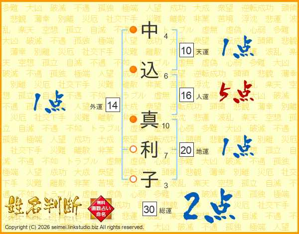中(4画)込(6画) 真(10画)利(7画)子(3画)