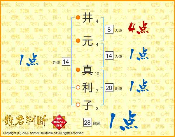 井(4画)元(4画) 真(10画)利(7画)子(3画)