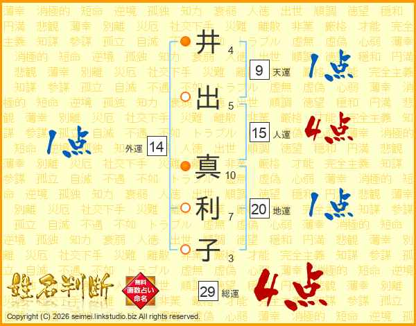 井(4画)出(5画) 真(10画)利(7画)子(3画)