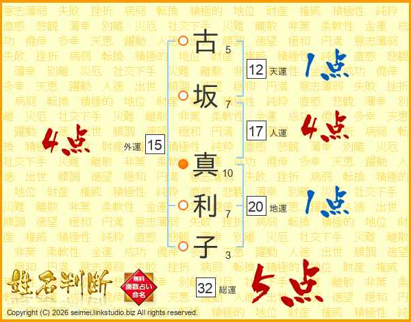 古(5画)坂(7画) 真(10画)利(7画)子(3画)