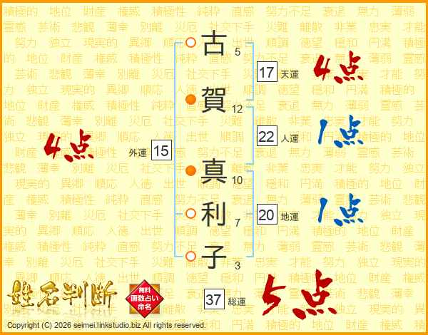 古(5画)賀(12画) 真(10画)利(7画)子(3画)