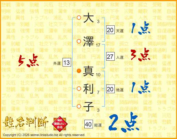 大(3画)澤(17画) 真(10画)利(7画)子(3画)