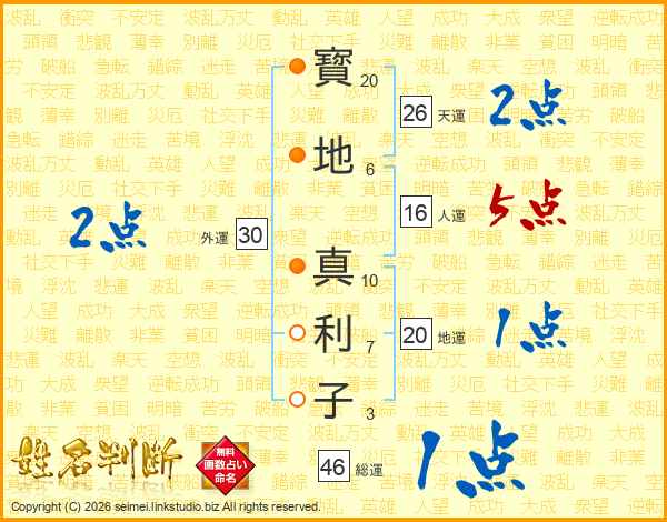 寳(20画)地(6画) 真(10画)利(7画)子(3画)