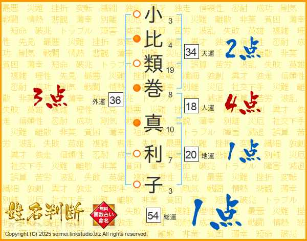 小(3画)比(4画)類(19画)巻(8画) 真(10画)利(7画)子(3画)