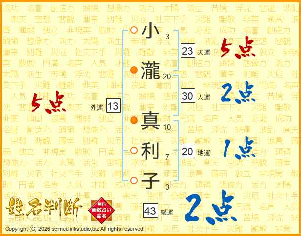 小(3画)瀧(20画) 真(10画)利(7画)子(3画)