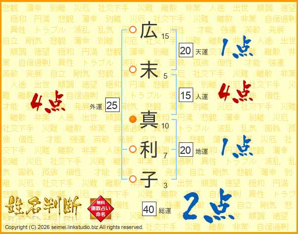 広(15画)末(5画) 真(10画)利(7画)子(3画)