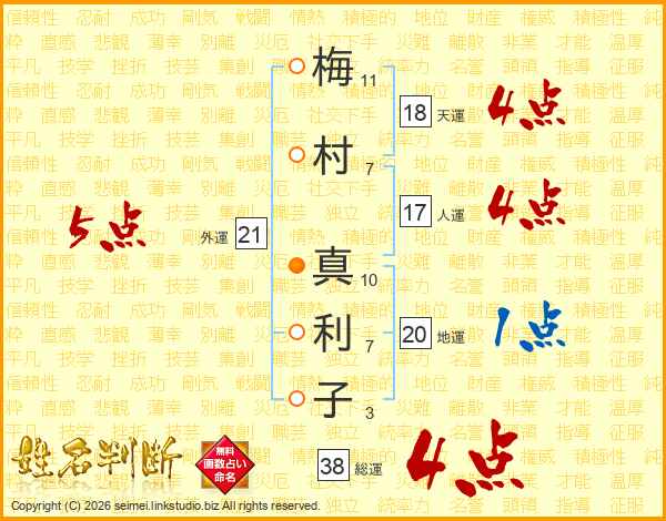 梅(11画)村(7画) 真(10画)利(7画)子(3画)