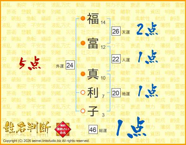 福(14画)富(12画) 真(10画)利(7画)子(3画)