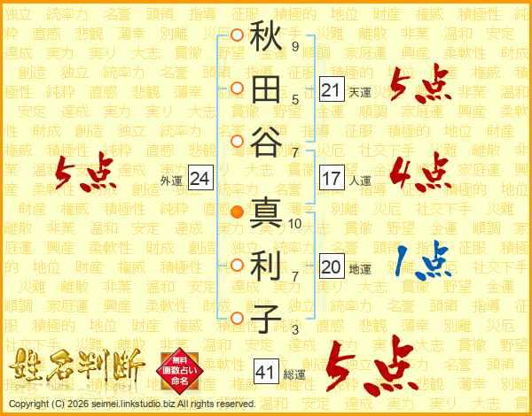 秋(9画)田(5画)谷(7画) 真(10画)利(7画)子(3画)