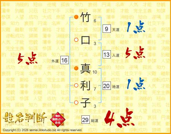 竹(6画)口(3画) 真(10画)利(7画)子(3画)