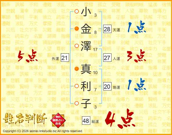 小(3画)金(8画)澤(17画) 真(10画)利(7画)子(3画)
