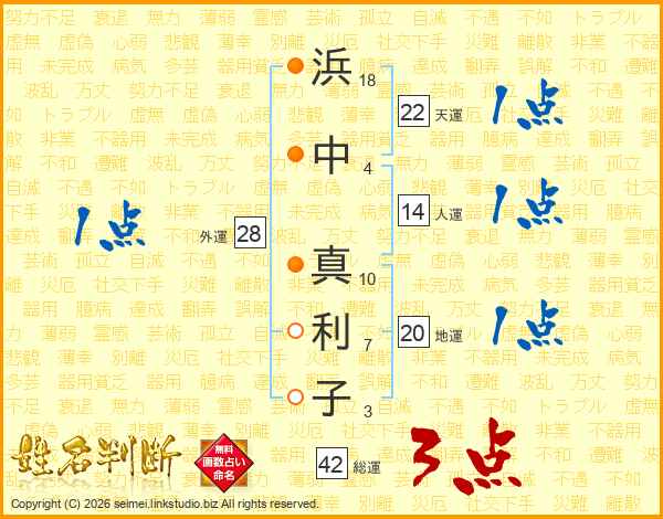 浜(18画)中(4画) 真(10画)利(7画)子(3画)