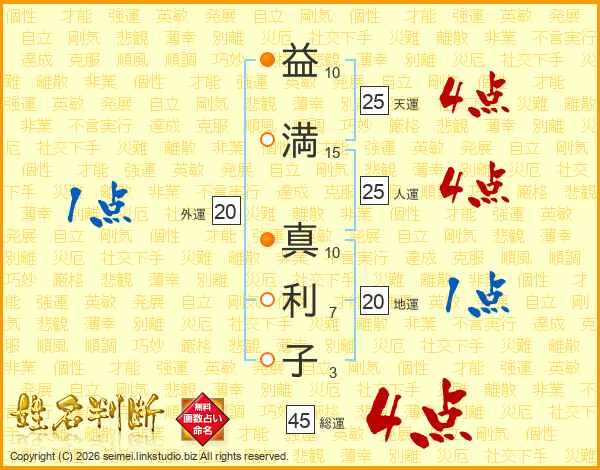 益(10画)満(15画) 真(10画)利(7画)子(3画)