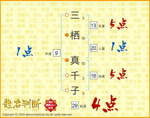 三(3画)栖(10画) 真(10画)千(3画)子(3画)