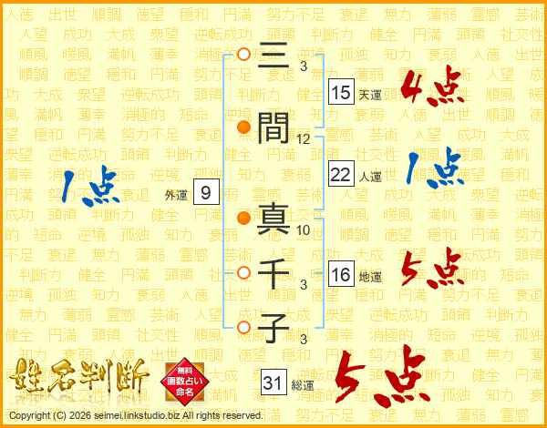 三(3画)間(12画) 真(10画)千(3画)子(3画)