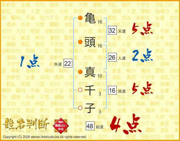 亀(16画)頭(16画) 真(10画)千(3画)子(3画)