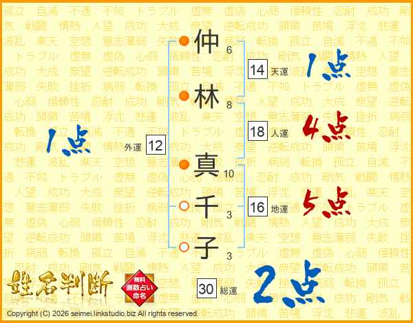 仲(6画)林(8画) 真(10画)千(3画)子(3画)