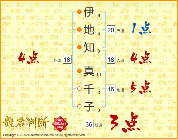 伊(6画)地(6画)知(8画) 真(10画)千(3画)子(3画)