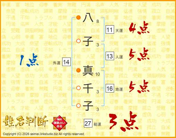 八子真千子さんの総運は27画の3点!