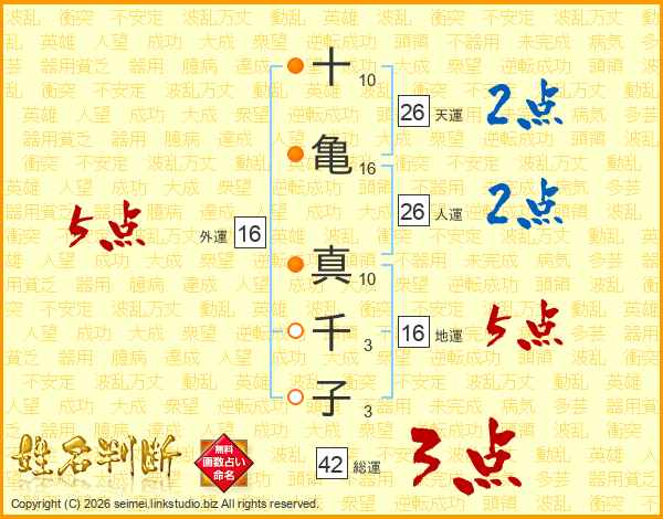 十(10画)亀(16画) 真(10画)千(3画)子(3画)