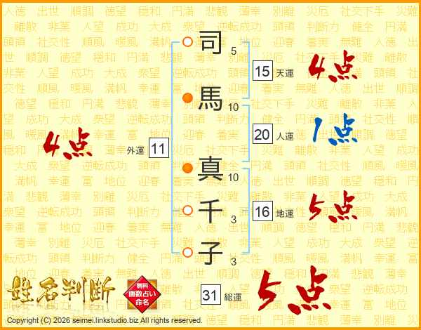 司馬真千子さんの総運は31画の5点!