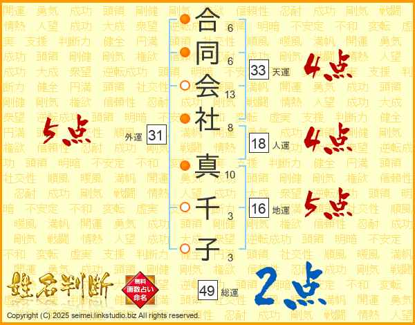 合(6画)同(6画)会(13画)社(8画) 真(10画)千(3画)子(3画)