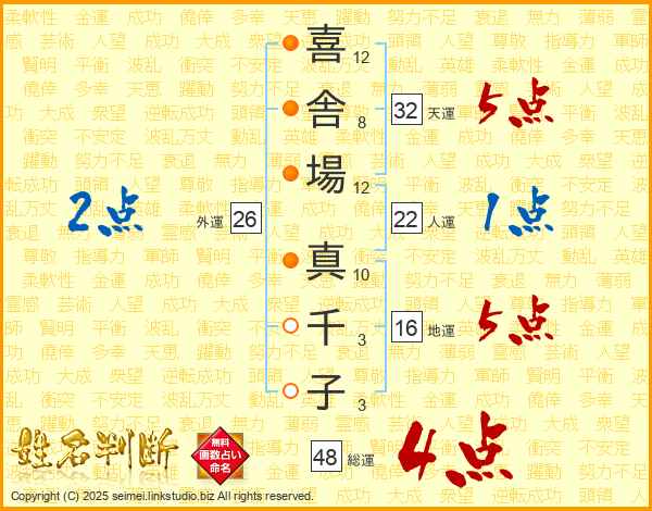喜(12画)舎(8画)場(12画) 真(10画)千(3画)子(3画)