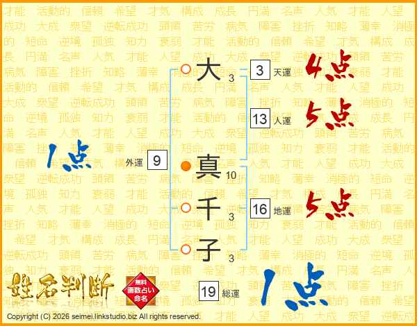 生活面を象徴する運勢です。外部から受ける影響力を表し、結婚運、家庭運や職場、環境への順応性を表します。総運から人運を引いた画数。姓や名が1文字の場合を除く。