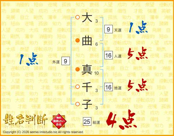 大(3画)曲(6画) 真(10画)千(3画)子(3画)