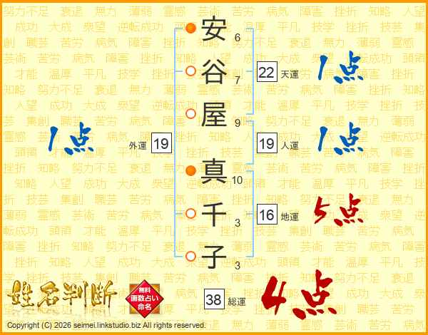 安(6画)谷(7画)屋(9画) 真(10画)千(3画)子(3画)
