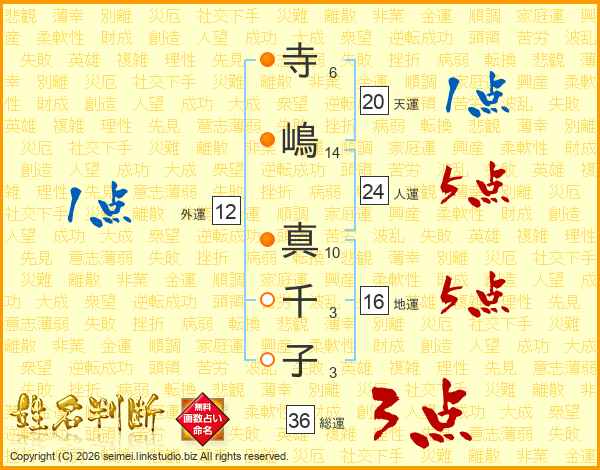 寺(6画)嶋(14画) 真(10画)千(3画)子(3画)