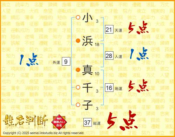 小(3画)浜(18画) 真(10画)千(3画)子(3画)