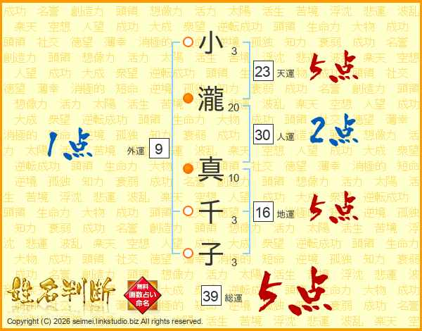 小(3画)瀧(20画) 真(10画)千(3画)子(3画)