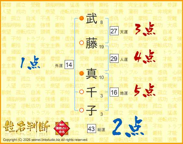 武(8画)藤(19画) 真(10画)千(3画)子(3画)