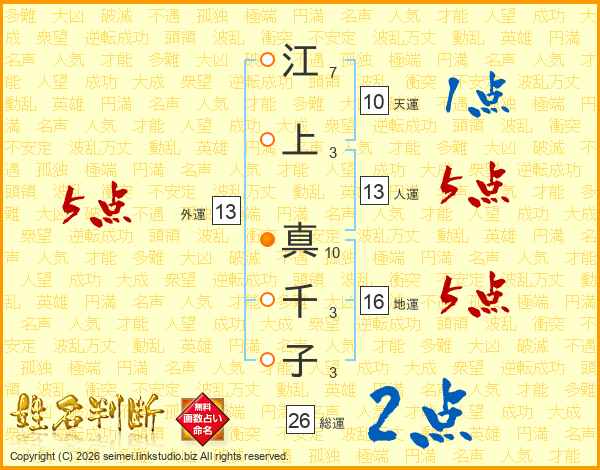 江(7画)上(3画) 真(10画)千(3画)子(3画)