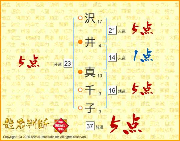 沢(17画)井(4画) 真(10画)千(3画)子(3画)