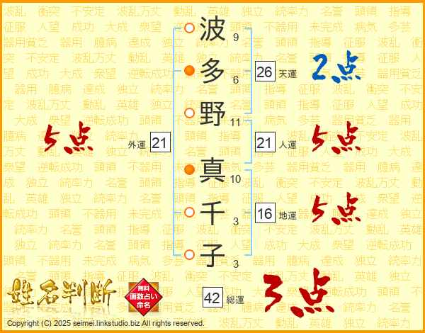 波(9画)多(6画)野(11画) 真(10画)千(3画)子(3画)