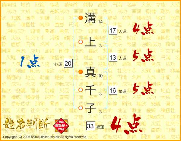 溝(14画)上(3画) 真(10画)千(3画)子(3画)