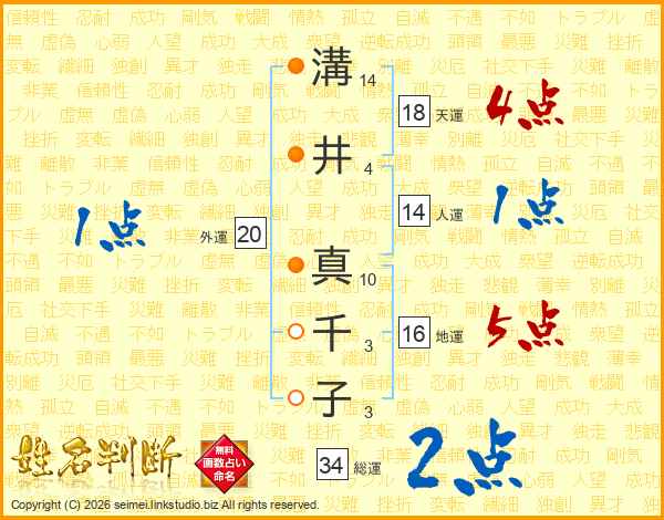 溝(14画)井(4画) 真(10画)千(3画)子(3画)