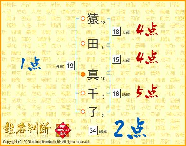 猿田真千子さんの総運は34画の2点!